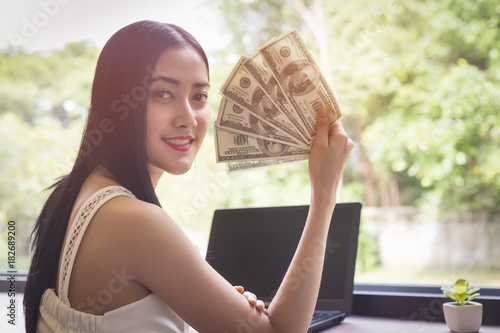Happy Face Of Asian Woman Sitting In Her Home Working With A